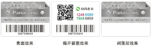 將防偽標(biāo)簽表層揭開,見二維碼、16位紅、藍(lán)、綠、黑四色防偽數(shù)碼及10位物流碼。